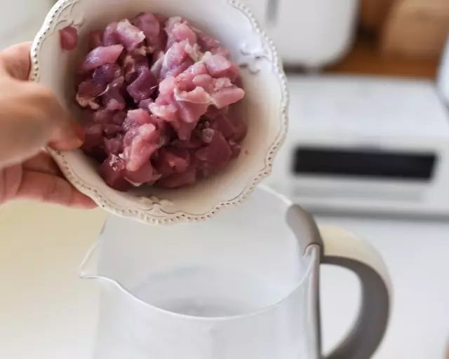 3.养生壶倒入少许油,放入葱、姜,再放入五花肉
