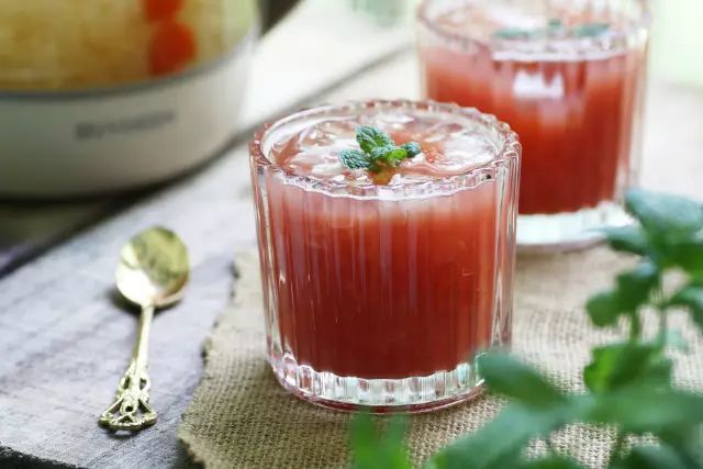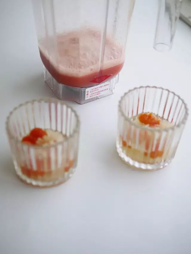 6.西瓜银耳羹装三分之一在杯中,别取西瓜榨汁备用;