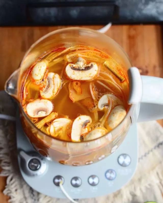 2.养生壶注入水,打开烧水模式,加一大勺冬阴功酱。