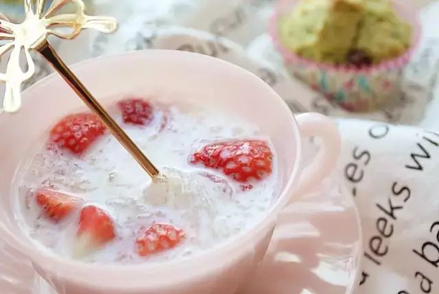 3.程序结束后倒入牛奶,少许炼乳,几颗草莓丁即可