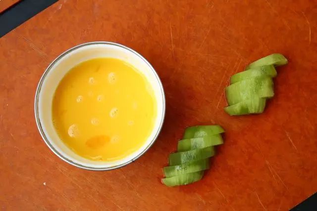 1. 鸡蛋打散,奇异果去皮切片,将牛奶倒入蛋液中,搅拌均匀,倒入炖盅里。
