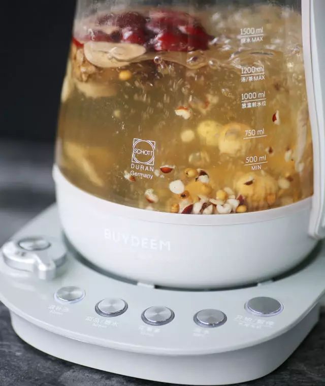 Step 2:将其余材料洗净,重新倒入1200ml水,连同猪/鸡肉一起放进养生壶内。选择滋补汤模式。(滋补汤模式为90分钟,如无滋补汤模式可以选择其他模式叠加时间)