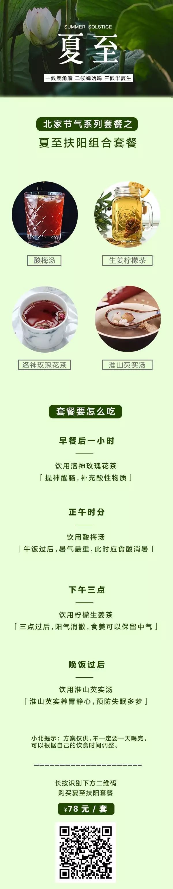夏至时节,重要的是要帮扶阳气,可以从最简单的一碗夏至汤开始。扶阳,顾名思义温补肾阳。另外春主肝夏主心,养心安神是夏季的一大养生重点之一。再者,夏季的时候湿暑交加,容易湿毒沾身,首先要先祛湿才能进行温补。