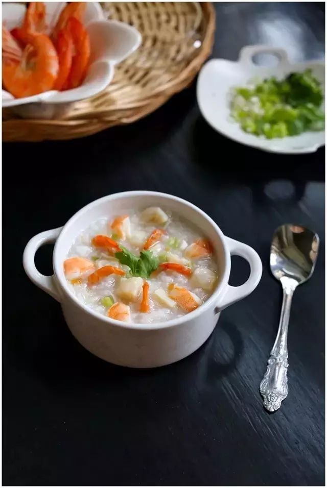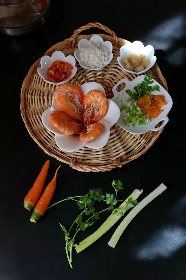 干贝 8粒、大米 1/4杯、虾米 20粒、小胡萝卜 半根、香菜 少许、葱花 少许、植物油 少许、海虾 3只(可省去)