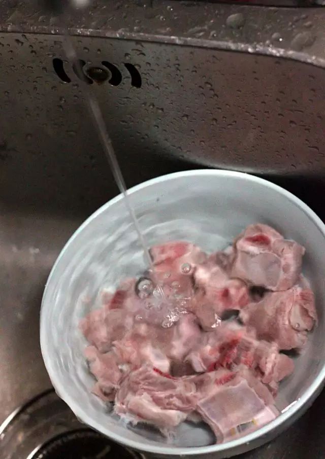 Step 2:将少量姜片和排骨放入锅内,加冷水煮开,等血色褪去后把水倒掉,同时用水冲洗下排骨。