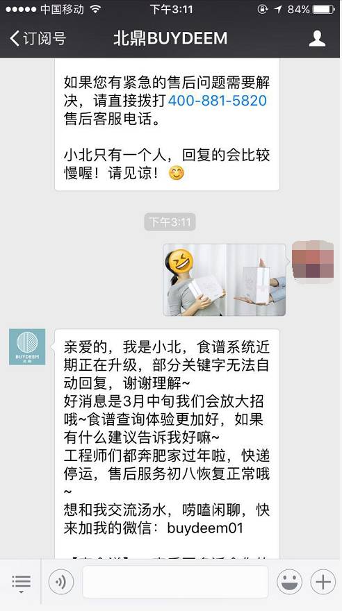 ⑤发送到BUYDEEM北鼎公众号给小北