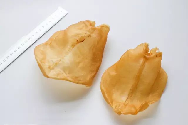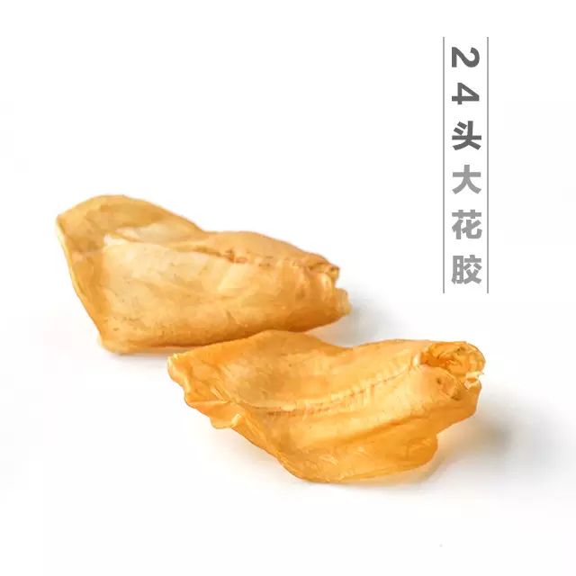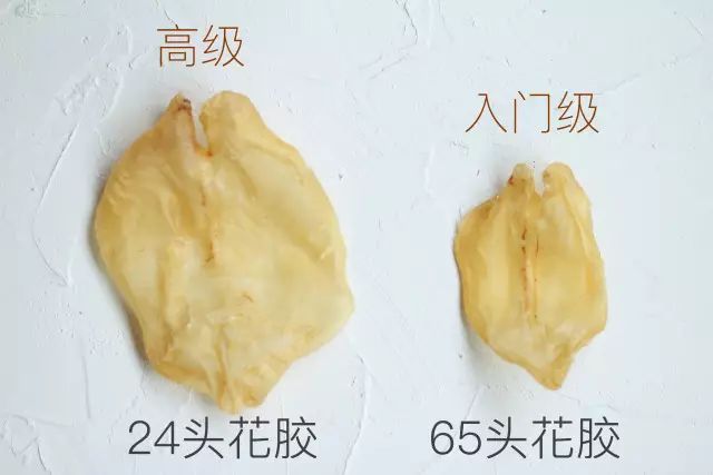 和鲍鱼一样,头数越小,价格越贵也越大。就拿24头花胶来解释,1公斤的花胶会有24片。