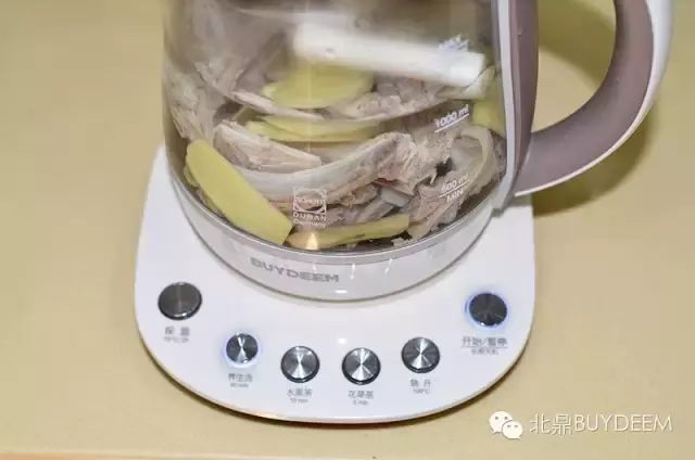 4.羊排洗净放入养生壶中,加入4片白萝卜片、2片姜;