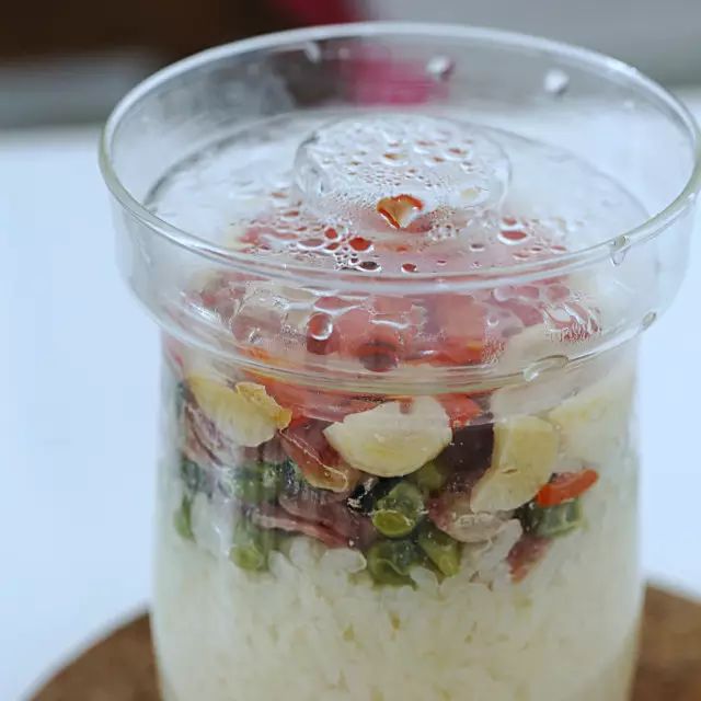 我一个人吃,放几颗喜欢的青豆和玉米,加大半杯米,感觉午饭能吃得圆滚滚了~两个人一起吃,一杯再多一些些,幸福也多一些些...