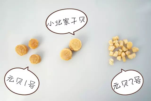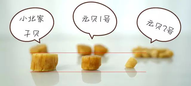 这三组同等重量干贝,分别来自某宝热销NO.1的元贝1号,不用多说就可以看到大小之间的差距;元贝2号是市面上常见的小瑶柱,小北和小伙伴们试吃后马上抱着我们的干贝逃跑了......