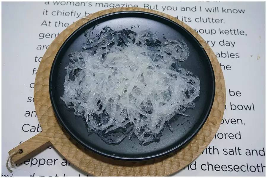 ▼燕窝泡发好后用小镊子夹掉燕窝里的杂毛后撕条。