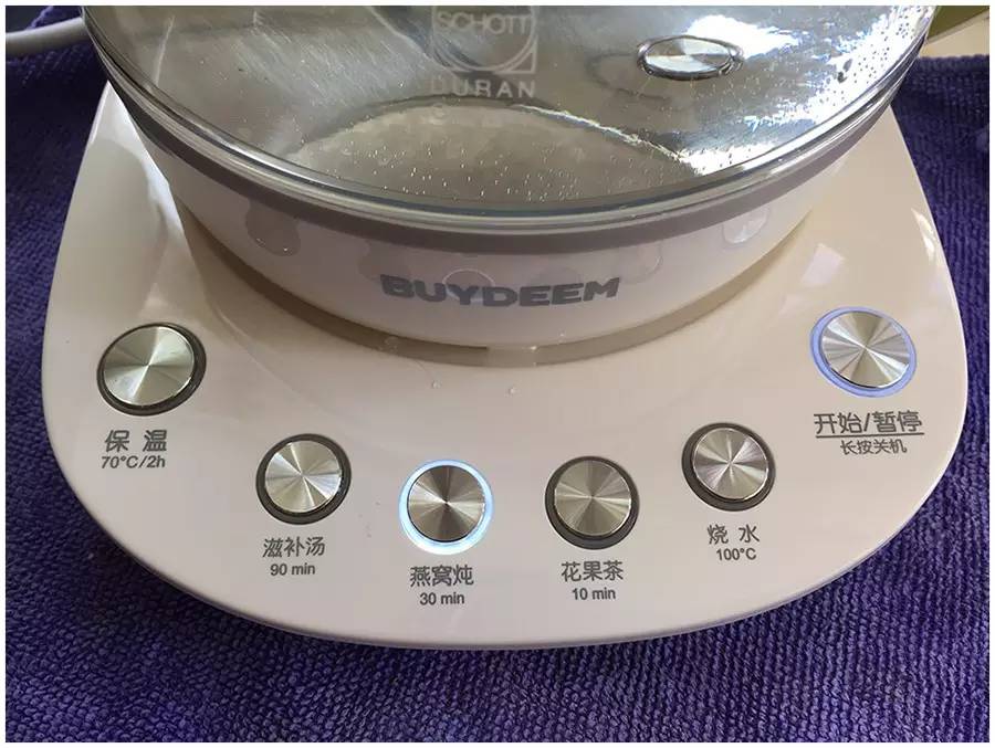 ▼选择燕窝炖模式,炖30分钟。 如果没有养生壶,可以用隔水炖盅代替,千万不能直接下锅炖。因为隔水炖温度没有那么高,高温会使燕窝中水溶蛋白质流失;比起传统的隔水炖盅北鼎养生壶更加轻巧方便且不占位置,透明壶身可以随时观察汤水的状况。