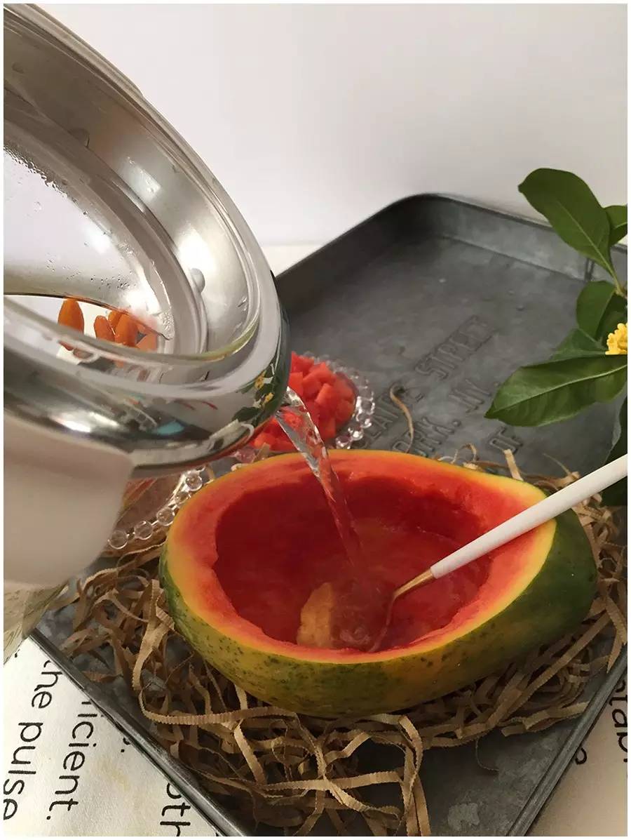 ▼将燕窝舀入木瓜盅,撒上木瓜丁。