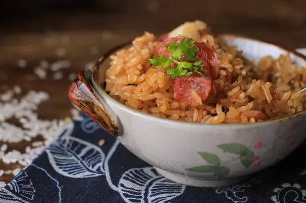 ②加入其它你想吃的食材平铺在大米上,启动养生汤/粥品功能(2个其中一个都可以),再按开始键,待自动断电后,香喷喷的一人食米饭就做好啦!