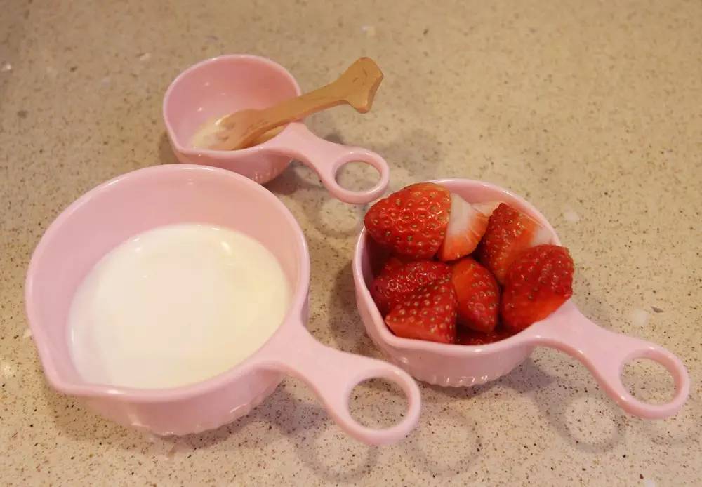 ④ 壶中加水放入炖盅,按燕窝炖键,程序结束后倒入牛奶,少许炼乳,几颗草莓丁即可。