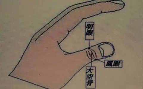 在我们的拇指上有三个相邻接的穴道,分别是明眼、凤眼、大空骨(如下图)。