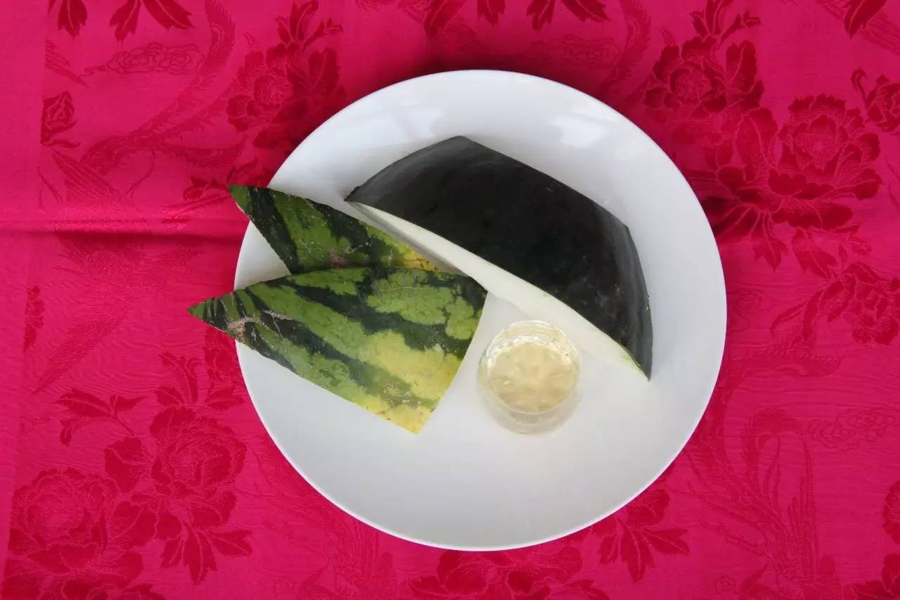 ▼西瓜皮、冬瓜皮洗净,用削皮刀薄薄地去除一层外皮后切块。