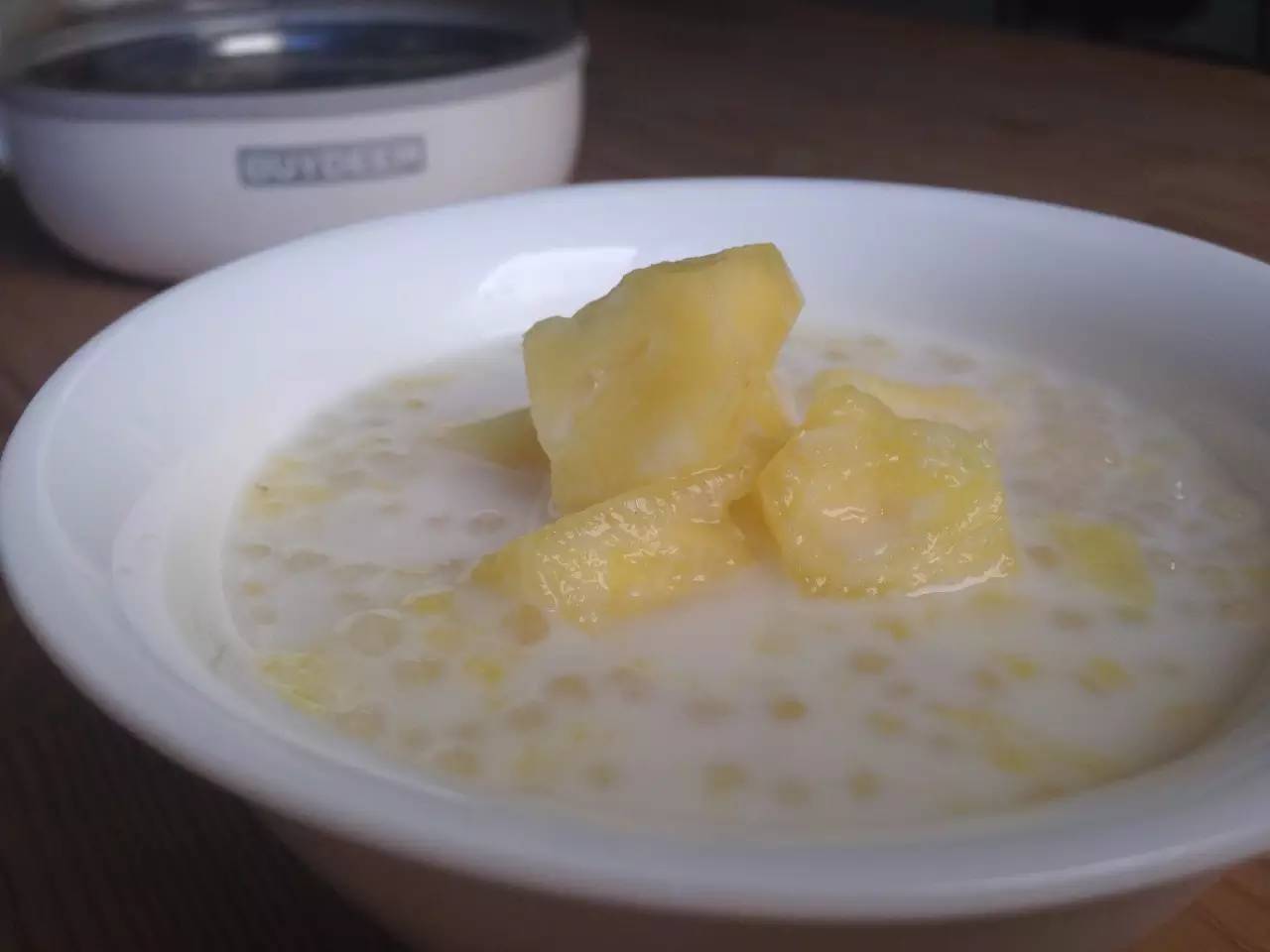 6.将椰汁、碎菠萝肉和西米混合,用勺子搅拌均匀。