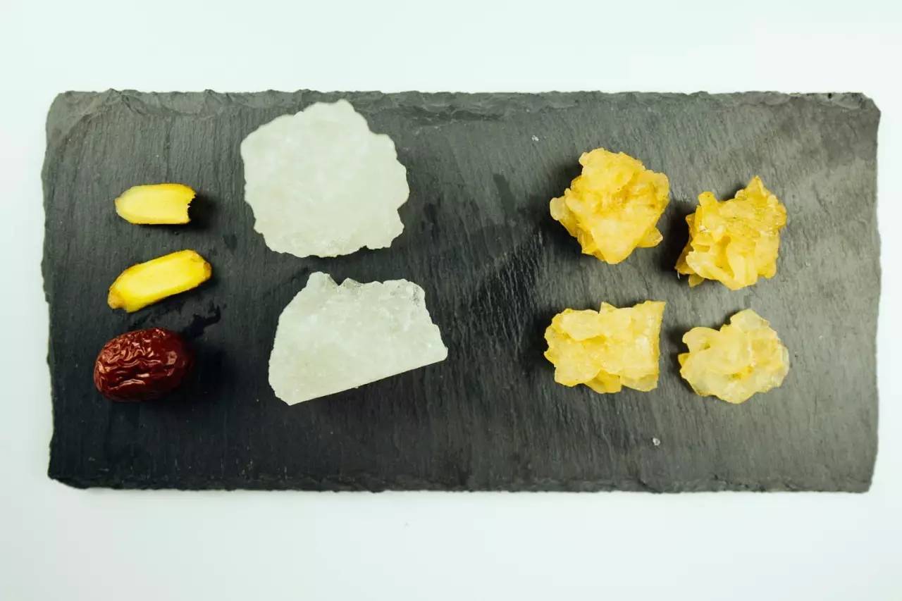 ▼雪蛤洗净,用冷水泡4-6小时;泡发后挑去筋膜和黑色的杂质。