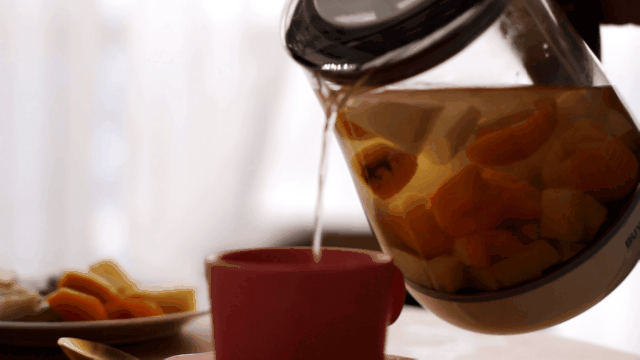 ▼所有食材放进养生壶,加入清水1000ml,启动“水果茶”模式,约10分钟。