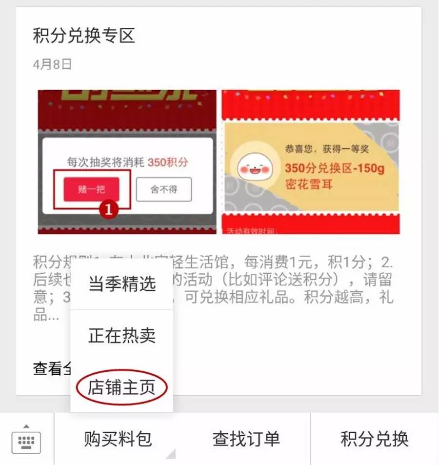 ▼从服务号点击购买料包,然后点击店铺主页。如果您已经在店铺里,可以忽略这一个步骤。