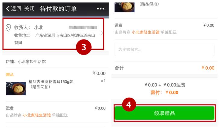 ▼ 准确填写收件人信息,拉到界面下方点击【领取赠品】