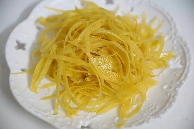 ▼柚子放在热水中浸泡约10分钟左右,用盐细细搓擦表皮,将柚子用水冲洗干净,剥皮刮去里面的白瓤,越薄越好;柚子皮用刀切成细丝,越细越好。