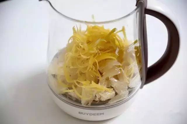 ▼将切好的柚子丝用热水浸泡,柚子肉去除白色瓤后瓣成小碎块,将柚子肉和柚子丝放入北鼎养生壶中。