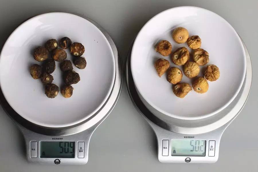 干燥没做好的无花果,不仅不易储存,容易变质,而且在购买时也会吃上一笔“水分”的大亏。同样重量的无花果,个头分量却有所差别,这还只是区区50克,若是500克,5000克,那数字怎么算……