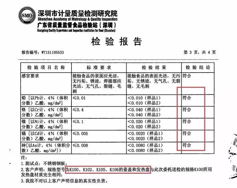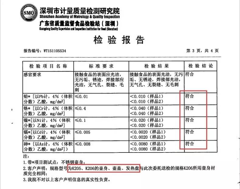 小北家的电热水壶不仅符合304不锈钢和还完全符合食品级不锈钢的双重标准,以下是检验报告