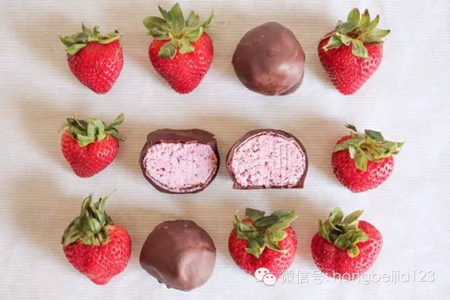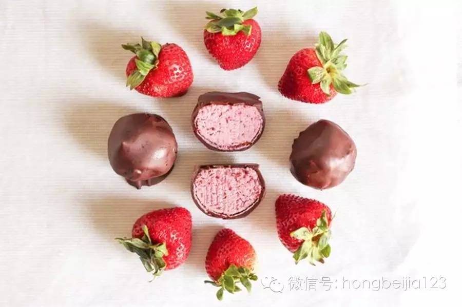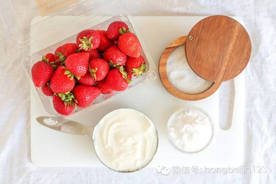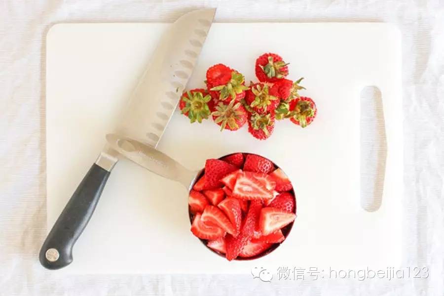 ▼清洗草莓,并切去顶部;可以对半切,一分为二,也可以一分为四,更容易混合;