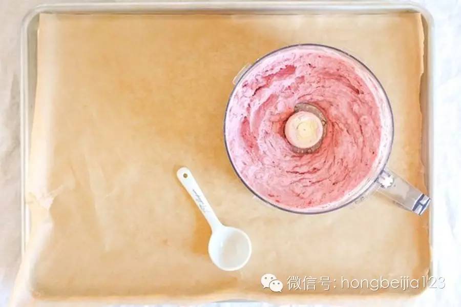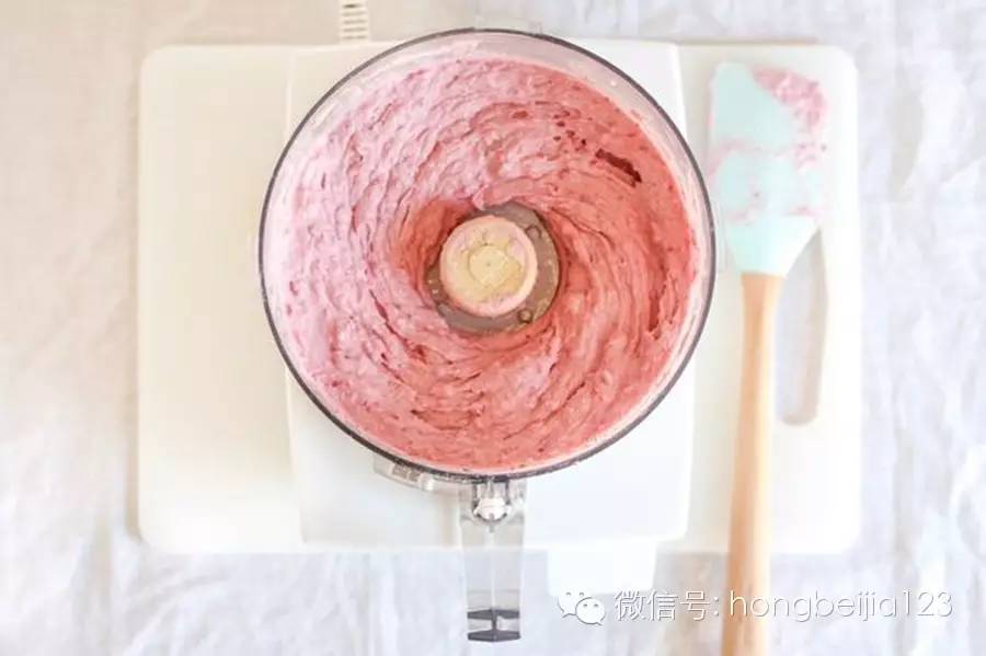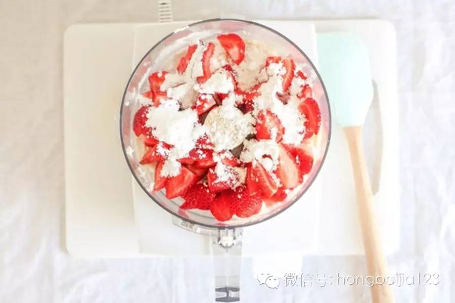 ▼将切好的草莓、椰子油、糖粉混合,放入食物处理机内;