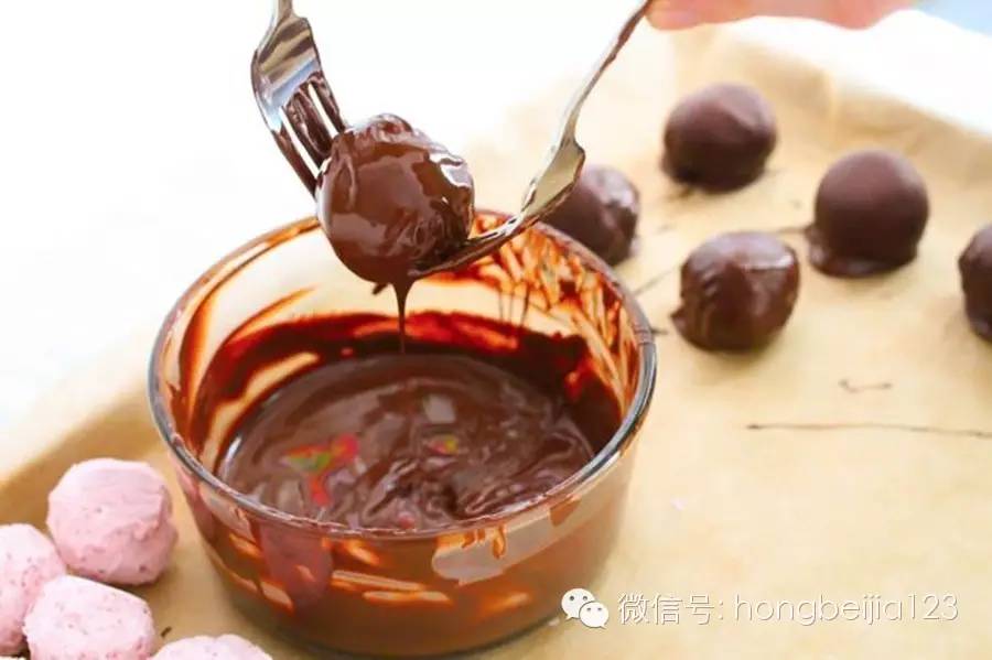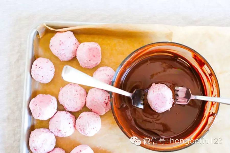 ▼调温巧克力备好之后,取出冻好的球形混合物;这里需要用两个叉子辅助,球形混合物放进巧克力中均匀包裹后再放回托盘,一次裹一个,别贪多;如果混合物还未加工完时,盆内的巧克力有要凝固的迹象,那么隔热水稍稍融化即可;