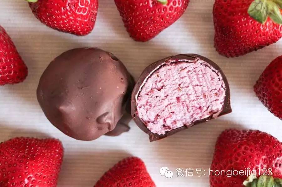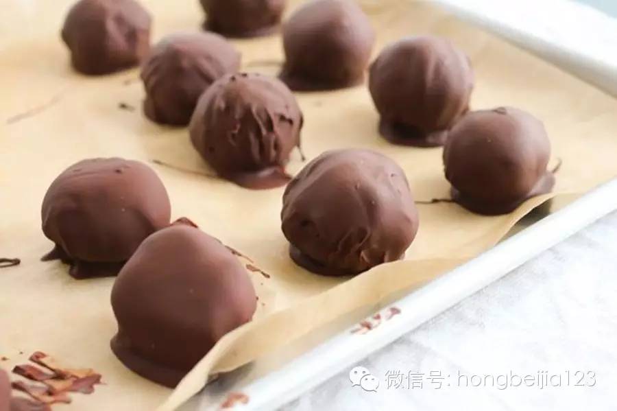 ▼所有球形混合物都包裹好巧克力之后再放入冰箱冷冻;整体成型后放保鲜盒冷藏保存;