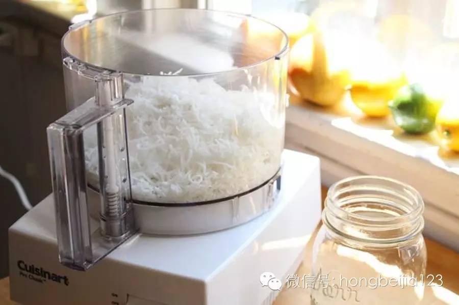 ▼将无糖椰子薄片放入食物处理机内搅打;请记得,230g是最少的量,因为椰子片过少的话,会在搅打过程中全部掉入搅拌机内部,所以这一步可增量不可减量;