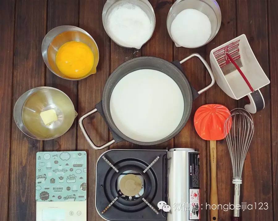 材料A:牛奶400g、细砂糖107g、蛋黄94g、低筋粉 26g、玉米淀粉 13g、发酵无盐黄油 22g材料B:鲜奶油223g