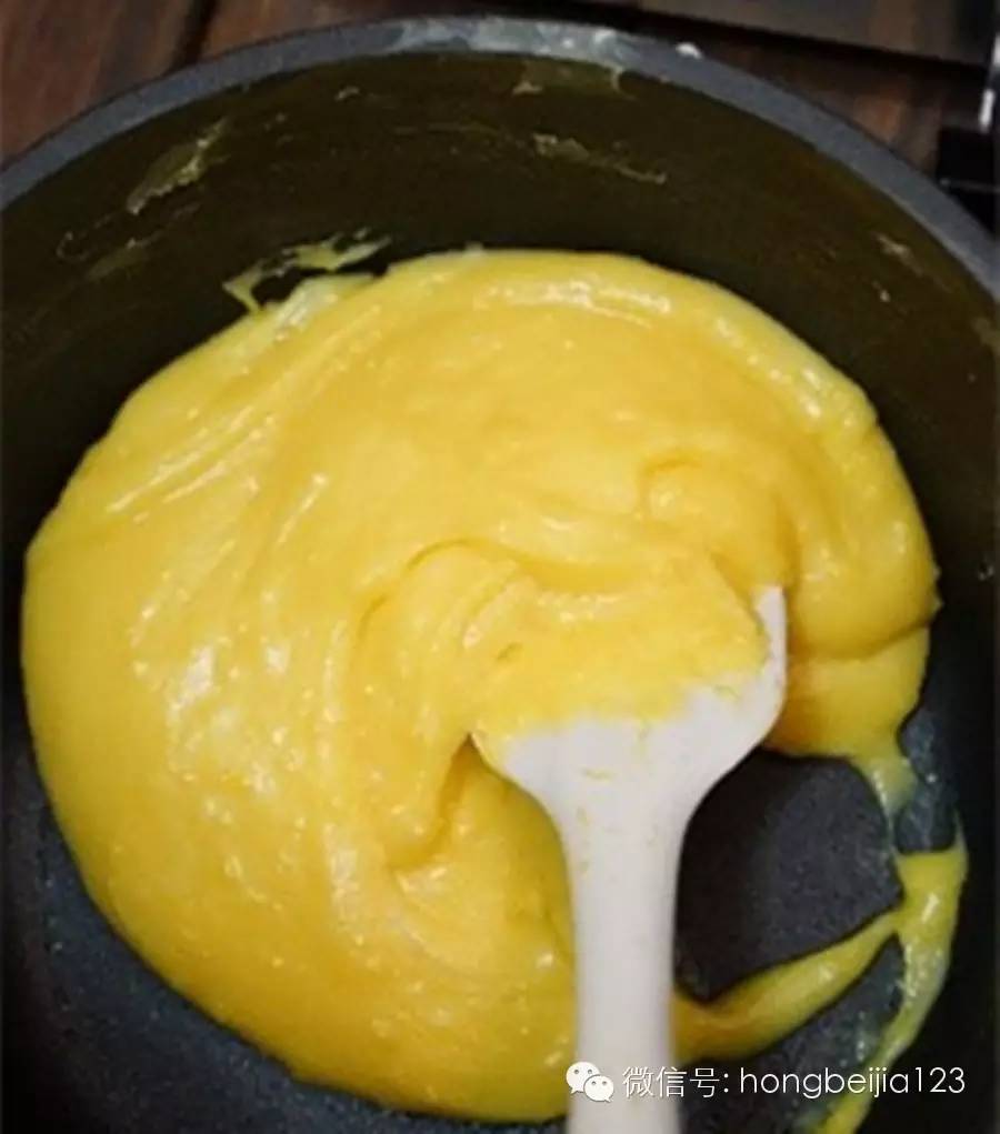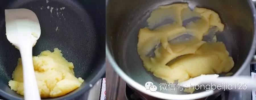 ▼再开中火加热,用刮刀不停搅拌,直至沸腾后持续性搅拌约4-5分钟,秘诀是大幅度甩打面糊,将面糊甩到锅的侧面,目的是为了蒸发水分,一边蒸发一边搅拌,直到蛋糊变得厚重;