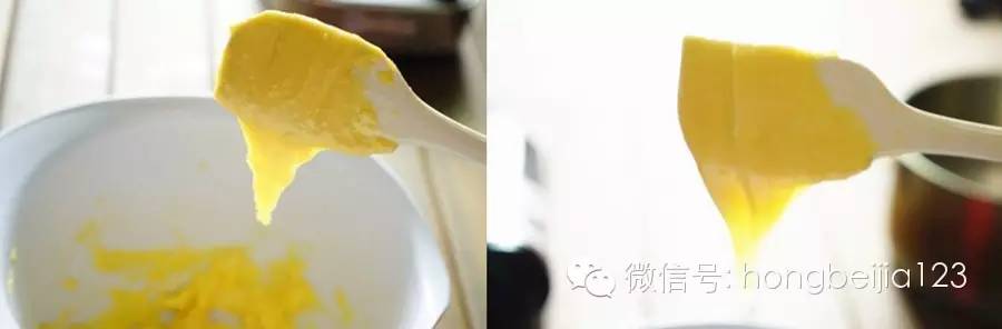 左图为不粘锅版本,面糊颗粒感严重;右图为不锈钢锅版本,可以看出面糊非常柔顺光滑
