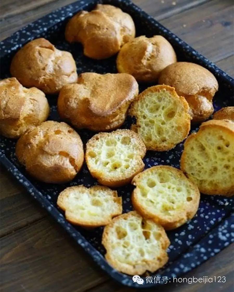 ▼不粘锅版本:外观形状奇怪,内里呈蜂窝状,不适合挤馅,不够外酥里软,膨胀力差,口感结实;
