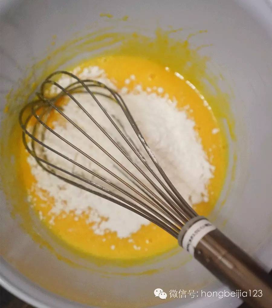 ▼倒入已经过筛的面粉,用打蛋器快速混合;