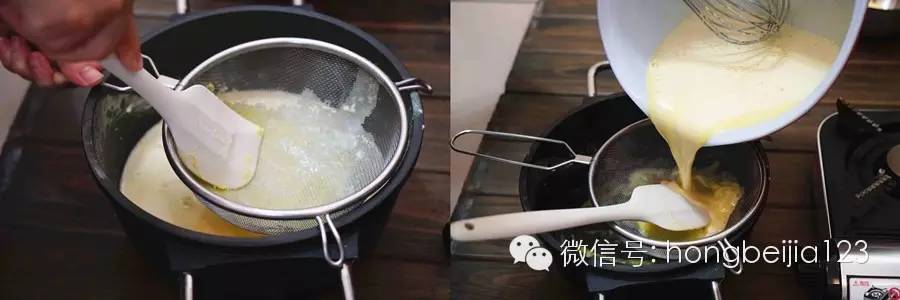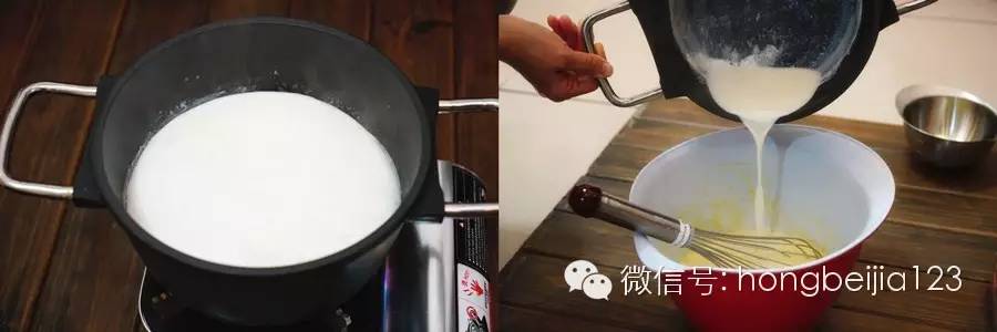 ▼沸腾20秒后立即停火,并将煮沸的牛奶倒入第1步的蛋黄盆中,慢慢搅拌均匀。用滤网过筛,再倒回煮牛奶的锅里;