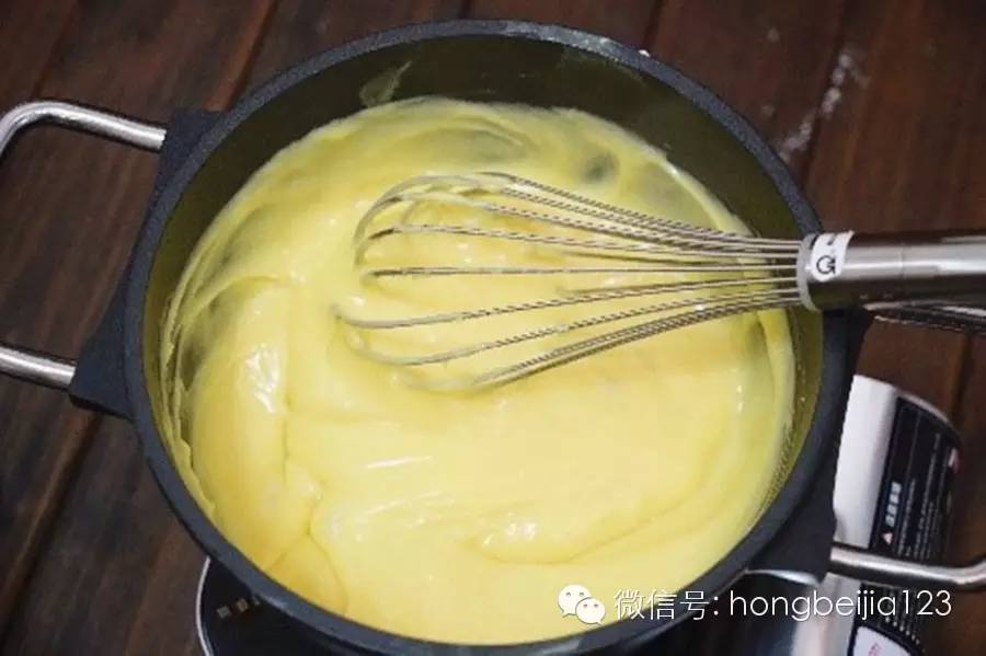 ▼大火加热,同时用刮刀不停搅拌。沸腾后变得粘稠,直到搅拌时能看到锅底,即暂时停火,用打蛋器不停的搅拌,尽可能均匀,直到出现粘稠顺滑的感觉为止;