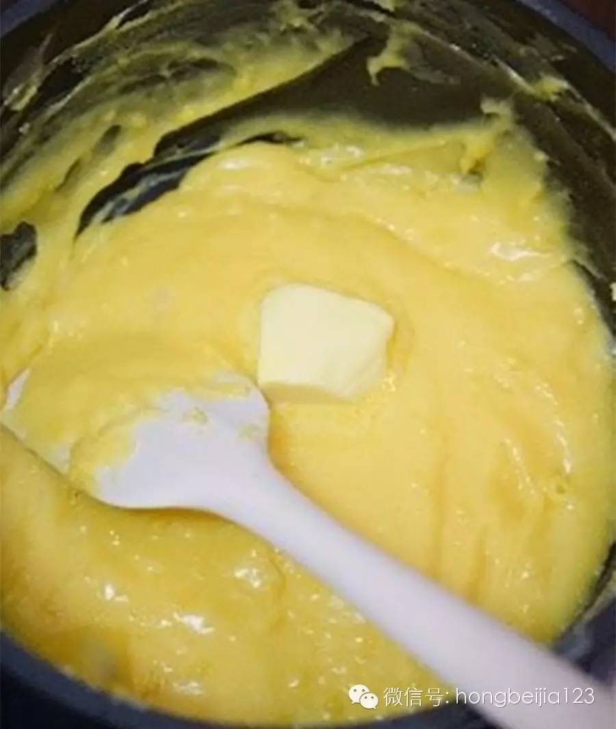 ▼煮到火候就停火,请注意不要刮盆,不要混入已经干涸凝结的蛋糊,停火后加入黄油,利用余温使黄油融化。继续搅拌,就会发现蛋糊出现美丽的光泽和醇厚的香气;