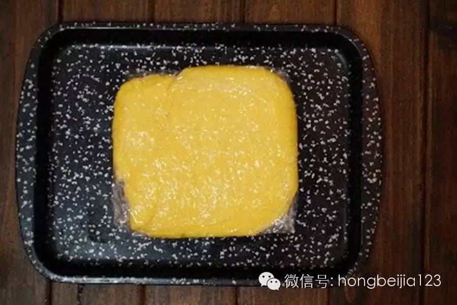 ▼马上将蛋糊转移到已铺好保鲜膜的托盘中,平置,趁热用保鲜膜覆盖。托盘下用冰块,上面一并放上冷却剂进行冷却。迅速制冷有助于牛奶蛋糊更加润口。如当天使用不完,可以密封冷藏进行保存,第二天再接着做;