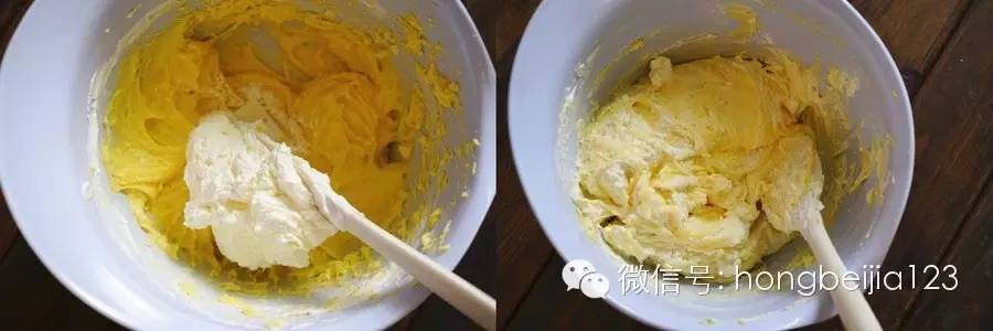 ▼制作好的牛奶蛋糊充分冷却后,换装到小盆里,用木质刮刀均匀搅拌,最初蛋糊比较硬,但用力挤压搅拌后,整体缓和很多,变得粘稠柔和,继续搅拌直至出现光泽。易可用电动打蛋器装单头低速进行搅拌,直到状态调整好即可;