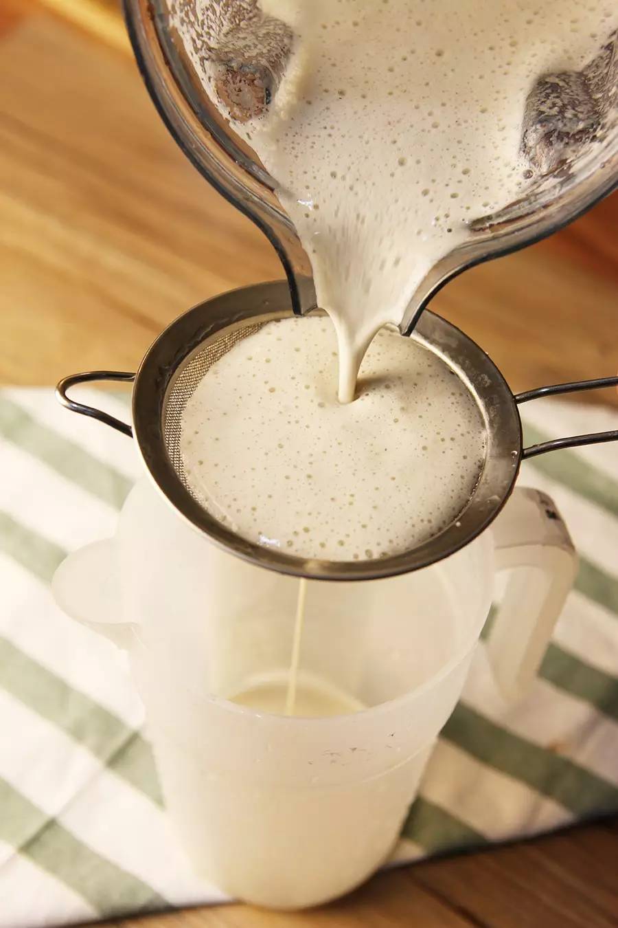 ▼用滤网将豆渣过滤,如果希望豆浆口感更为细腻,可以使用滤渣布,把豆汁全部挤到锅里