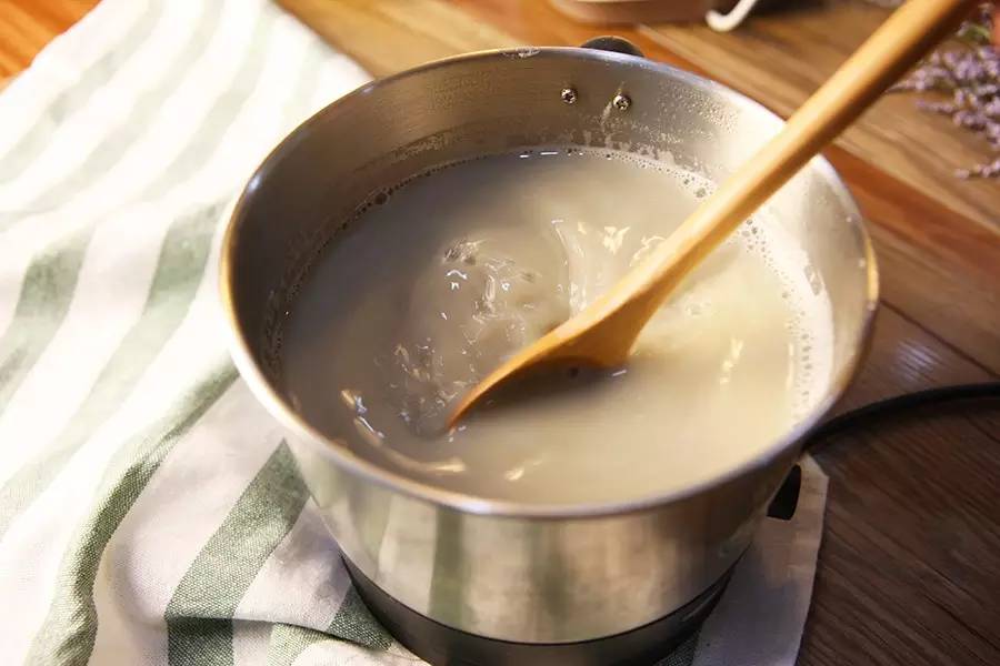 ▼开中火煮豆汁,过程中需要用木勺不停搅拌,不让豆浆糊底。