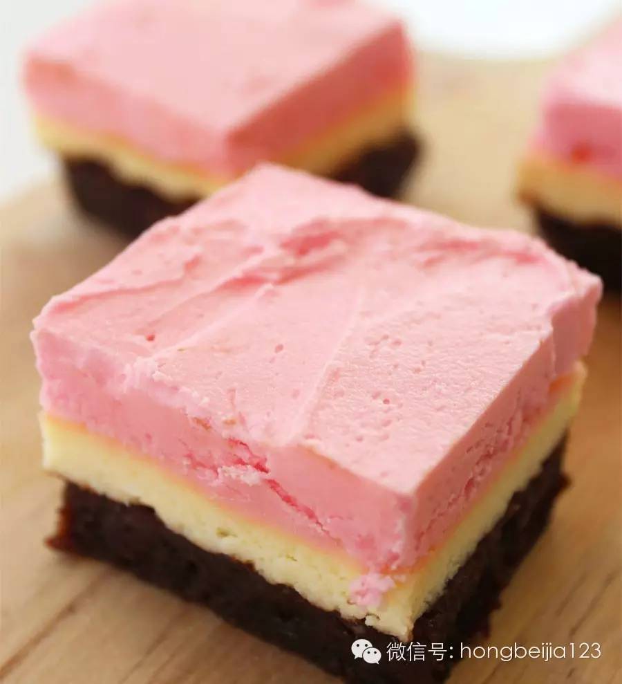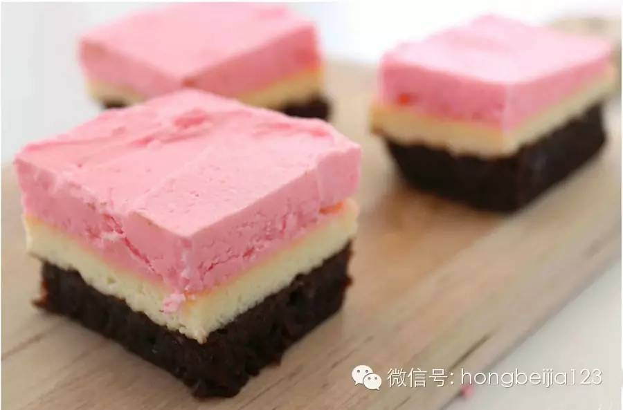 蛋糕的造型会不会让你想到小时候非常喜欢的一款冰淇淋?三个颜色三种味道,真是不可替代的记忆。这个蛋糕工艺并不难,只是制作的过程稍微有些繁杂:布朗尼面糊制作好先烤制20分钟后晾凉;芝士、奶油、鸡蛋与糖混合均匀倒入装有布朗尼的模具,再烤制35分钟左右后晾凉;奶油打发与草莓果酱(看,草莓果酱也非常百搭好用哦)混合,如果还想更粉一些,可以添加适量红色食用色素,在烤好的蛋糕上方铺平抹匀送入冰箱冷藏2小时就可以吃吃吃了,跟小时候的味道非常像呢。