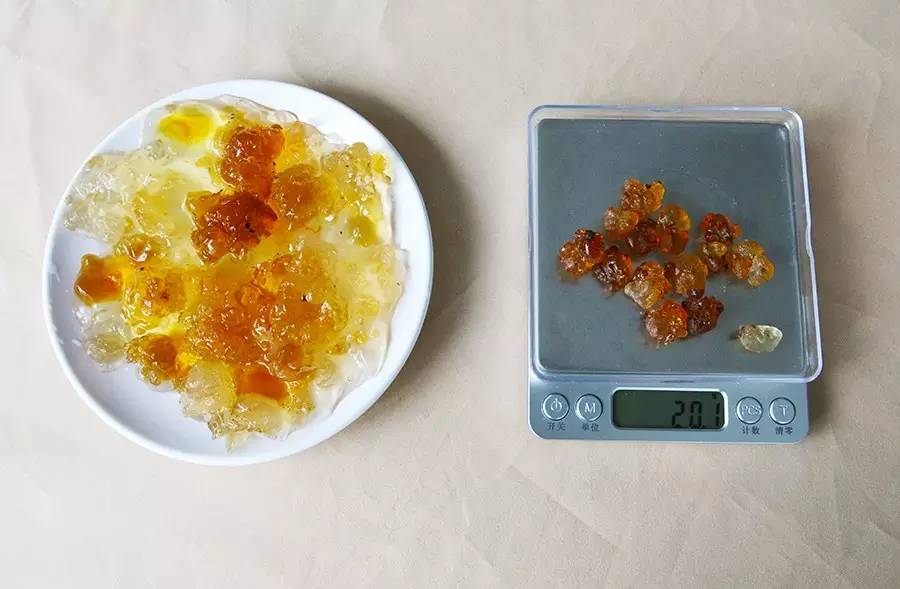 还是那句话,长得好看未必是真的,有人往桃胶里掺入其他胶,比如松胶。那个看起来很美,但放置的时间越长,掺了松胶的产品就越黄越漂亮,纯天然的则会变黑变丑。天然的桃胶是桃树干上渗出的树胶,没有固定的形态和大小,色泽也深浅不均匀。但好的桃胶也未必是越丑越好,其中有秘诀。