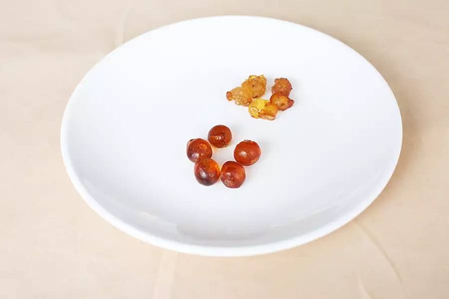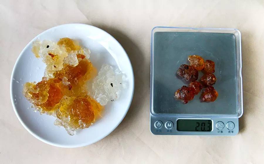 另外再说一下,目前市面上所见的桃胶主要有两种。一种是原生态桃胶,就是从树上采集下来后,进行粗加工,便以原生的形态上市销售了。另一种则是经过加工提纯,或者进行打磨抛光过的桃胶产品,这类产品的外形更光鲜。两种产品都有可能掺假,但是经过加工的产品掺假后会更难识别。